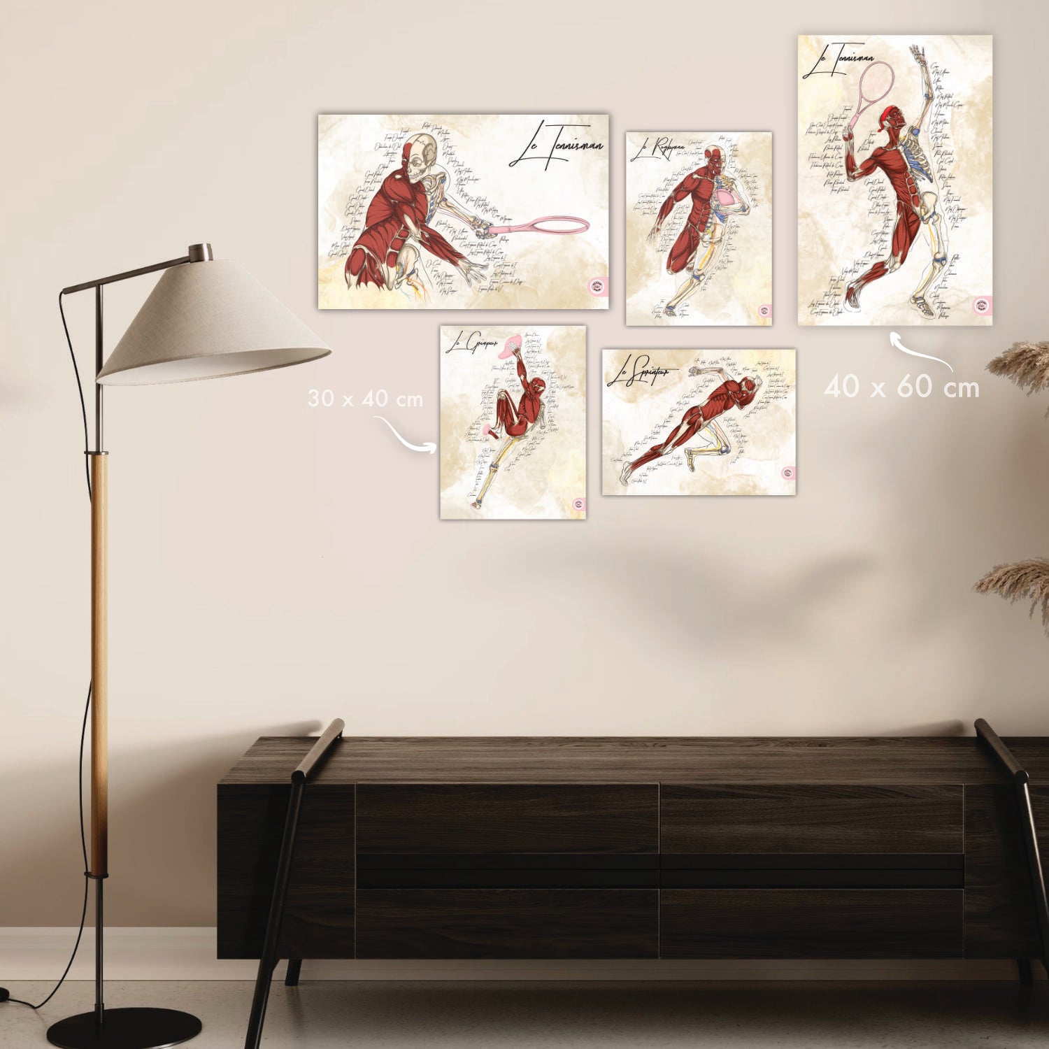 - Équivalent A2 (40x60 cm) : Pour un effet WAOU, les posters grands formats sont ceux qui mettent le mieux en avant l'anatomie du joueur. Un lot de 3 à 5 écorchés de sportifs sera optimal pour un grand mur blanc.